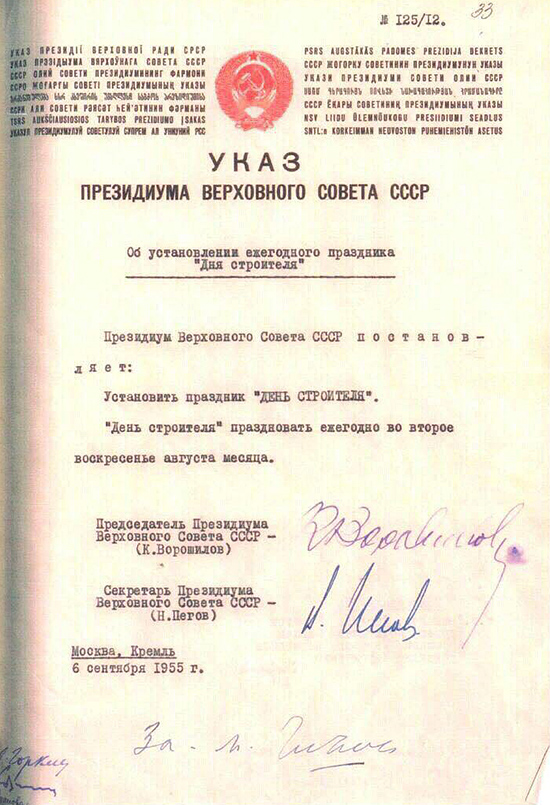- 6 сентября 1955 года вышел Указ Президиума Верховного Совета СССР „Об установлении ежегодного праздника «Дня строителя»“.