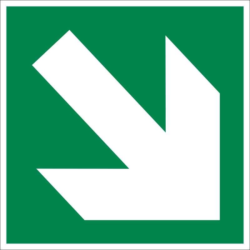Эвакуационные знаки необходимы для того, чтобы организовать маршруты эвакуации, которые обеспечат выполнение сотрудниками предприятия правильных действий при возникновении чрезвычайных ситуаций. К их числу относится и «Направляющая стрелка под углом 45°», используемая вместе с основным эвакуационным знаком безопасности или как пиктограмма, дополняющая световой указатель выхода. Белая стрелка на зеленом фоне указывает направление, в котором следует двигаться людям при пожаре или в другом экстренном случае.