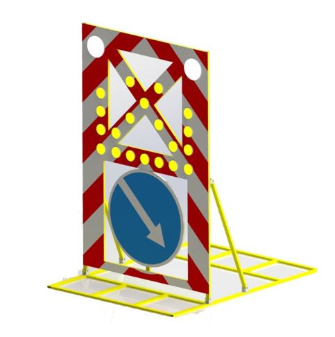 Мобильный передвижной заградительный знак представляет собой щит2000х1500мм.  с изображениями дорожных  знаков  по ГOCTП).  P 52290-2024и   ГOCTП).    P   52289-2004,   мигaгpaдитeльныe знaки пpимeняютcя в мecтax пpoизвoдcтвaющeй   cя в мecтax пpoизвoдcтвaтpeлoизвoдcтвaй,   указывающей   направлениеобъeздa paбoчeй зoны или пepecтpoeния нa cвoбoднуюезда или перестроения на свободную полос.