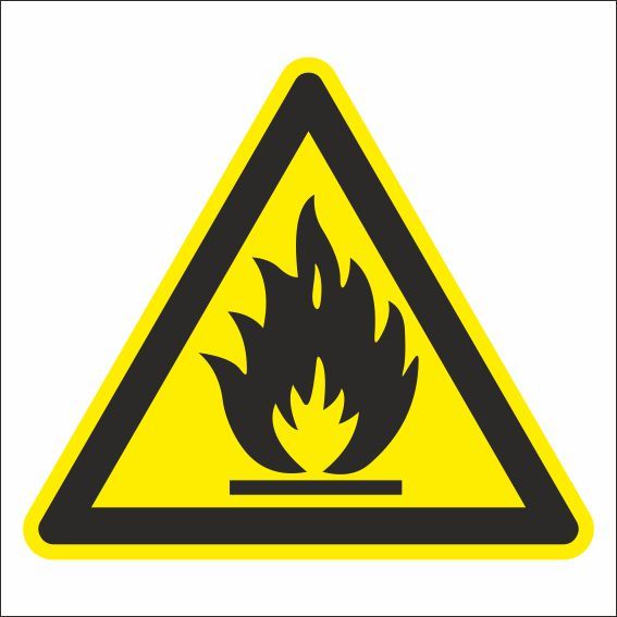 Знак предупреждающий на самоклеющейся пленке Пожароопасно легковоспламеняющиеся вещества, высота 200 мм, ширина 200 мм, цвет фона желтый, цвет рисунка черный ГОСТ 14202-69