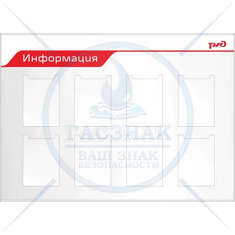Стенд Промышленная безопасность РЖД, 8 объемных кармана А4 вертик. (1150х1100; Пластик ПВХ 4 мм, алюминиевый профиль; )