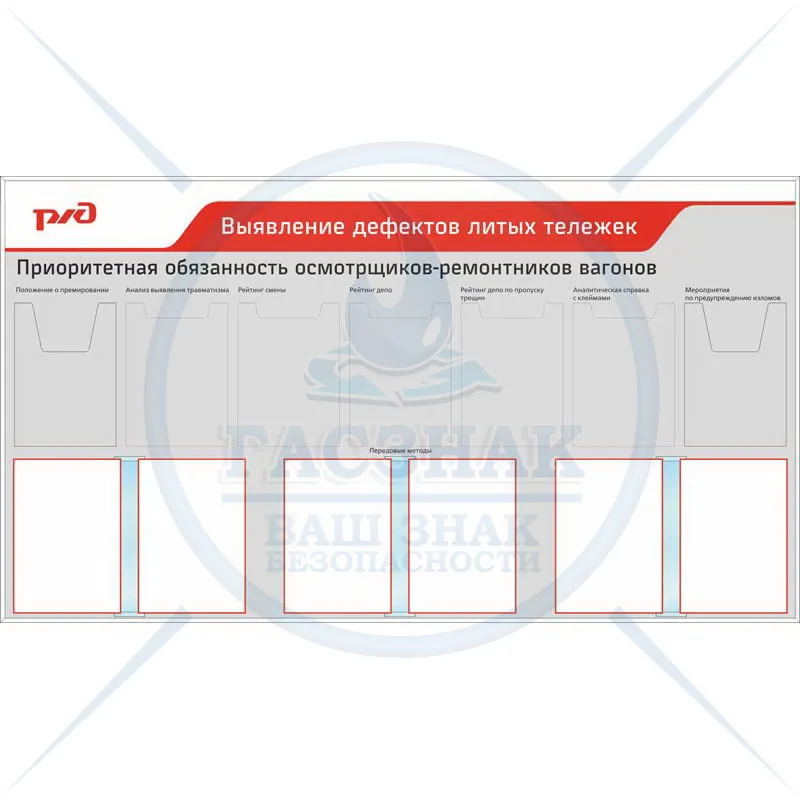 Стенд Промышленная безопасность РЖД, 8 объемных кармана А4 вертик. (1150х1100; Пластик ПВХ 4 мм, алюминиевый профиль; )