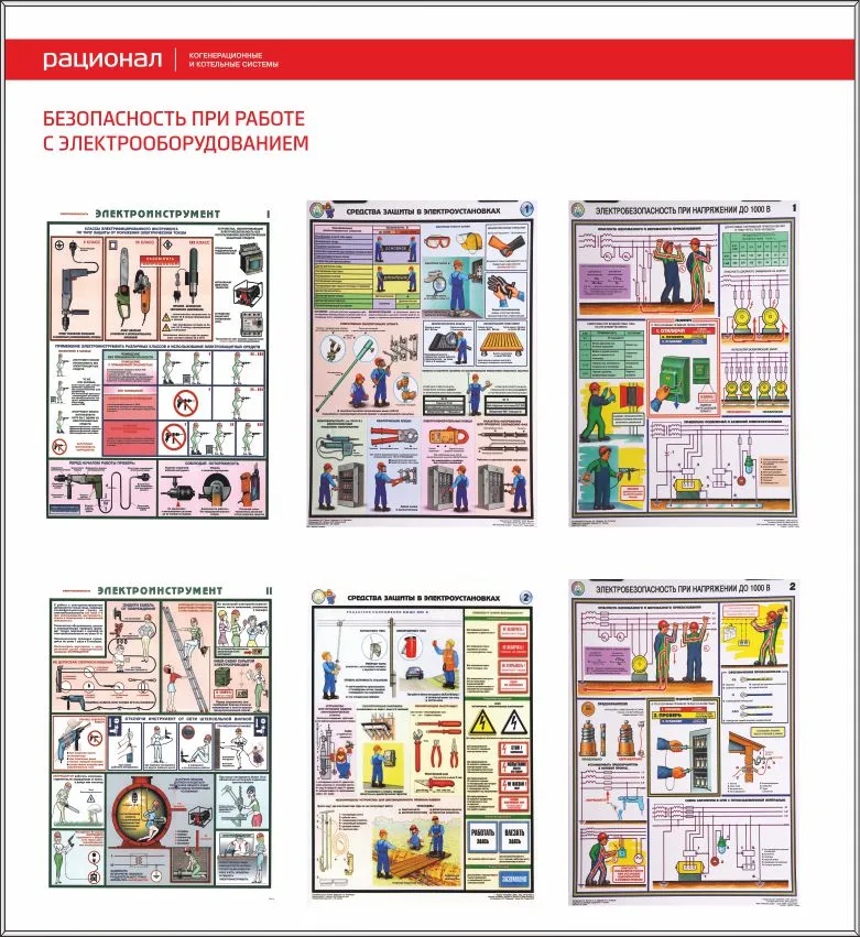 Стенд Безопасность при работе с электрооборудованием, 6 плакатов А3 (1100х1200; Пластик ПВХ 4 мм; Алюминиевый профиль)