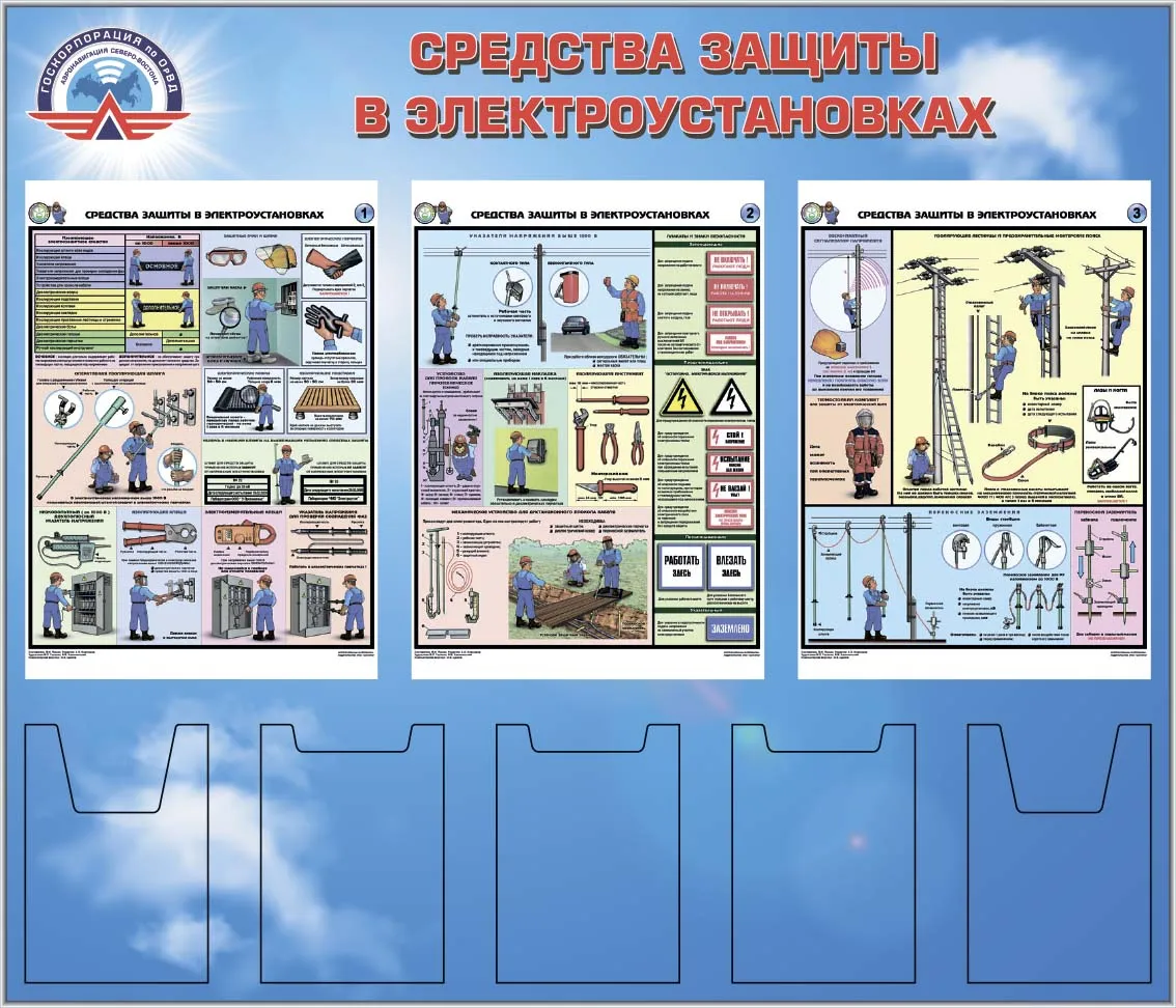 Стенд Средства защиты в электроустановках 3 плоских кармана А4, 2 объёмных кармана А4, 3 плаката А2 (1400х1200, Пластик ПВХ 4 мм, пластиковый профиль)