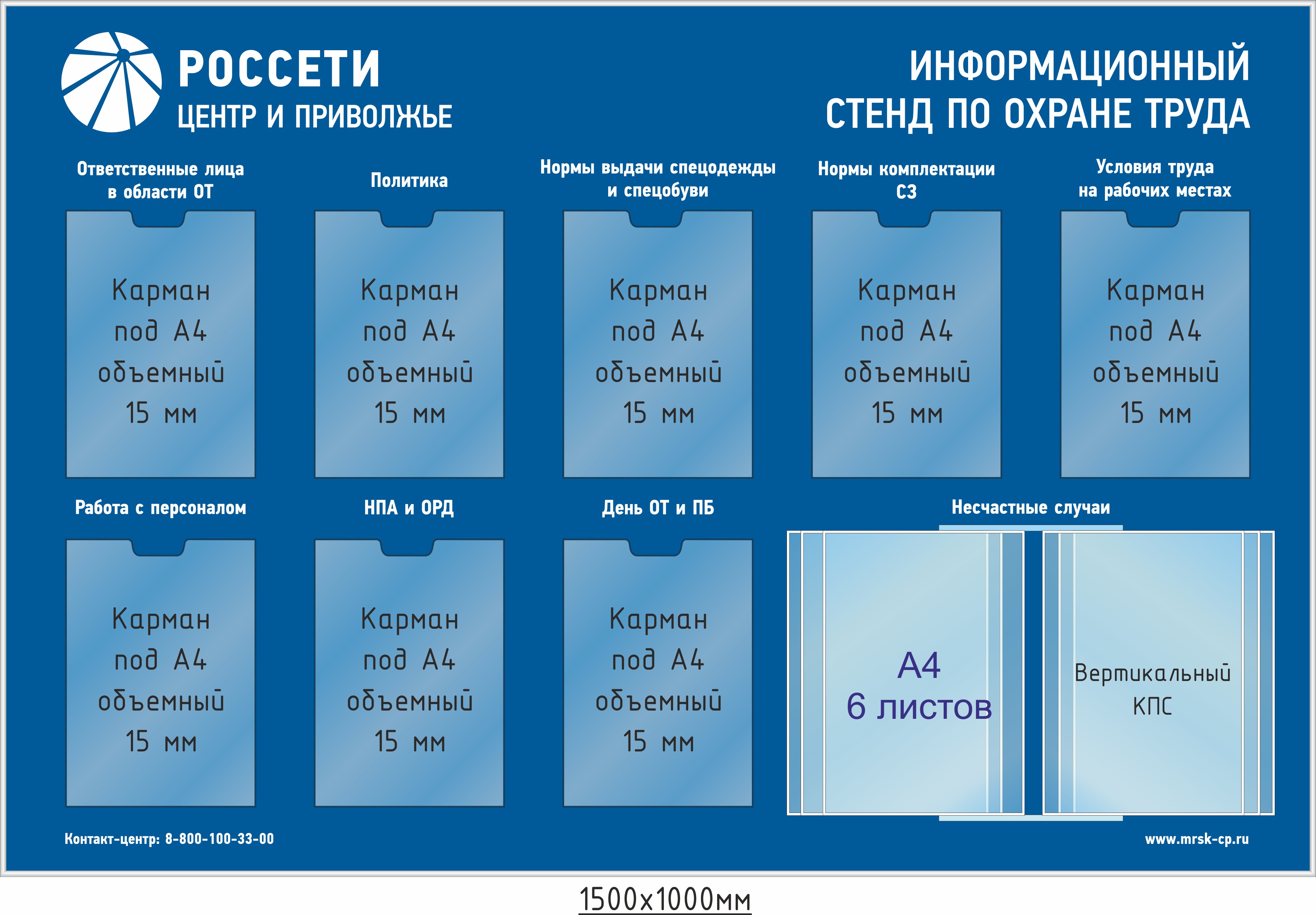 Информационный стенд по ОТ_8 объемных (15 мм) вертик. карманов А4, перекидная система  A4, вертик. на 6 рамок. Логотип Россети центр и приволжье