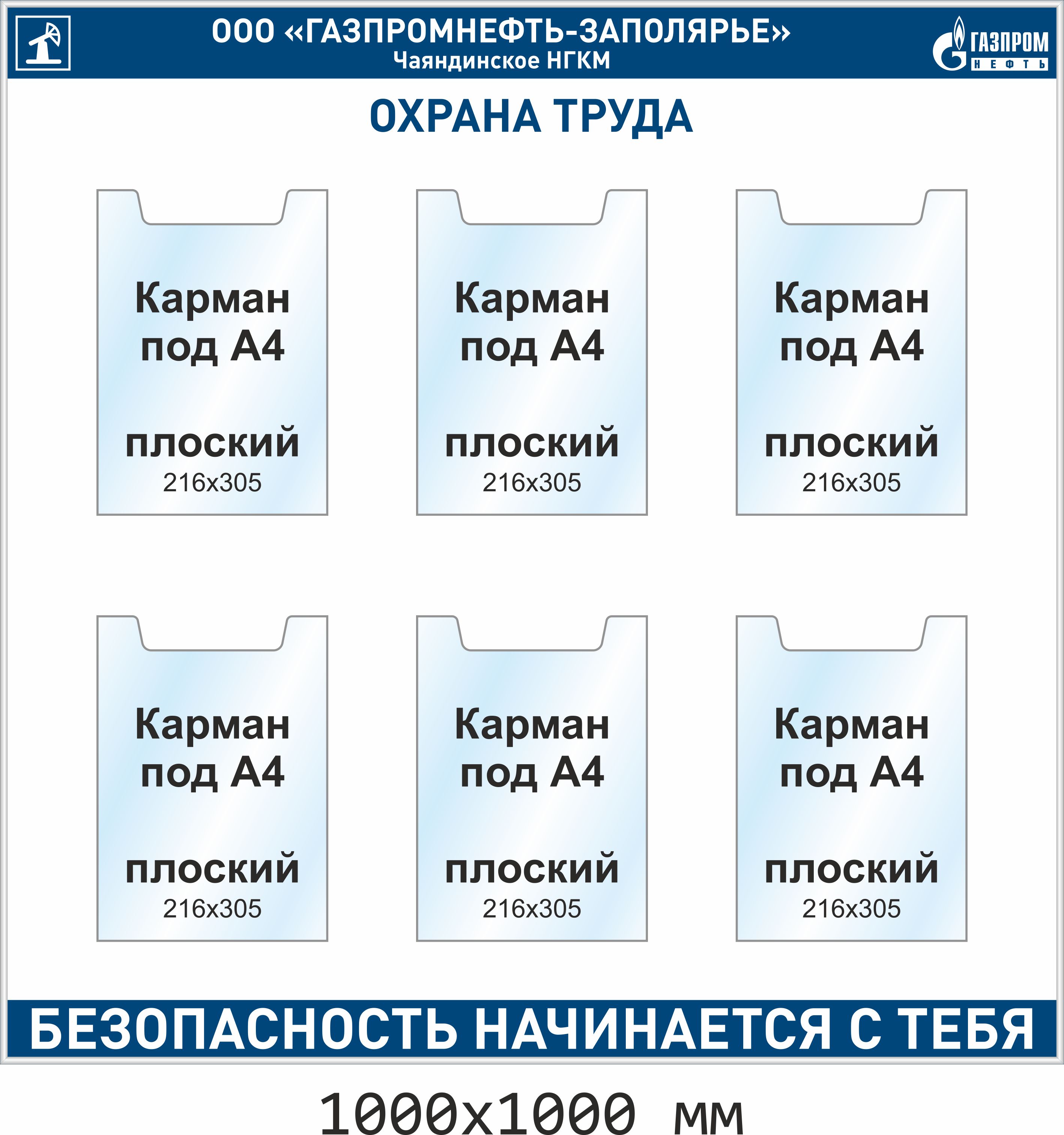 Стенд Охрана труда (фриз с надписью и логотипом Газпромнефть) 1000х1000 мм Пластик ПВХ 4 мм, алюминиевый профиль Карман А4 вертикальный плоский-6 шт