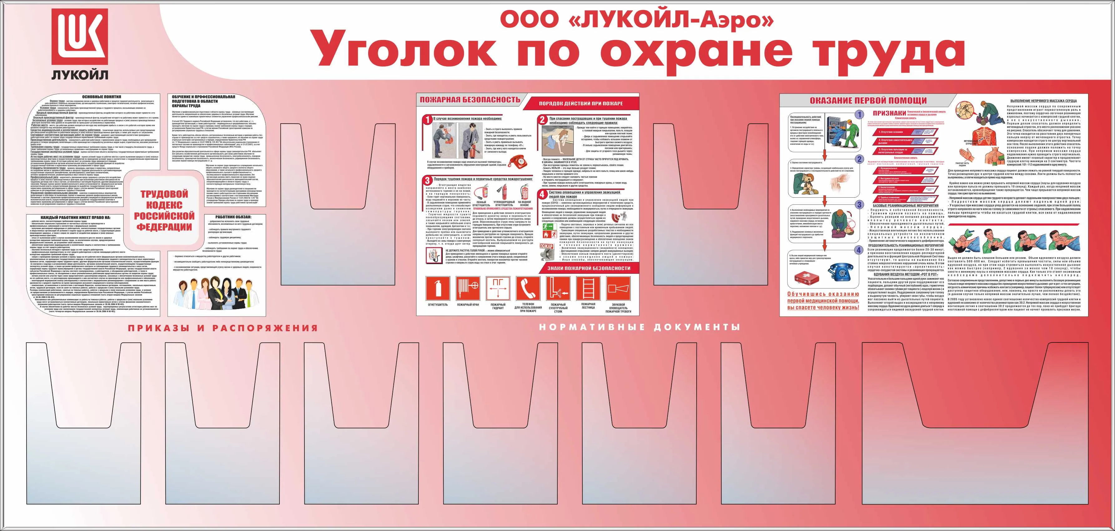 Стенд - Охрана труда. Карман плоский горизонтальный А4-2шт, карман плоский вертикальный А4-4шт, перекидное устройство А4 на 10 рамок (1200х1000; Пластик ПВХ 4 мм, алюминиевый профиль)