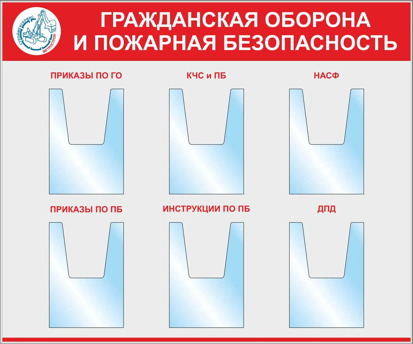 Стенд Пожарная Безопасность, серый фон, красные буквы, 6 объемных карманов А4 с надписями (Пластик ПВХ 4 мм, алюминиевый профиль; 1200х1000)