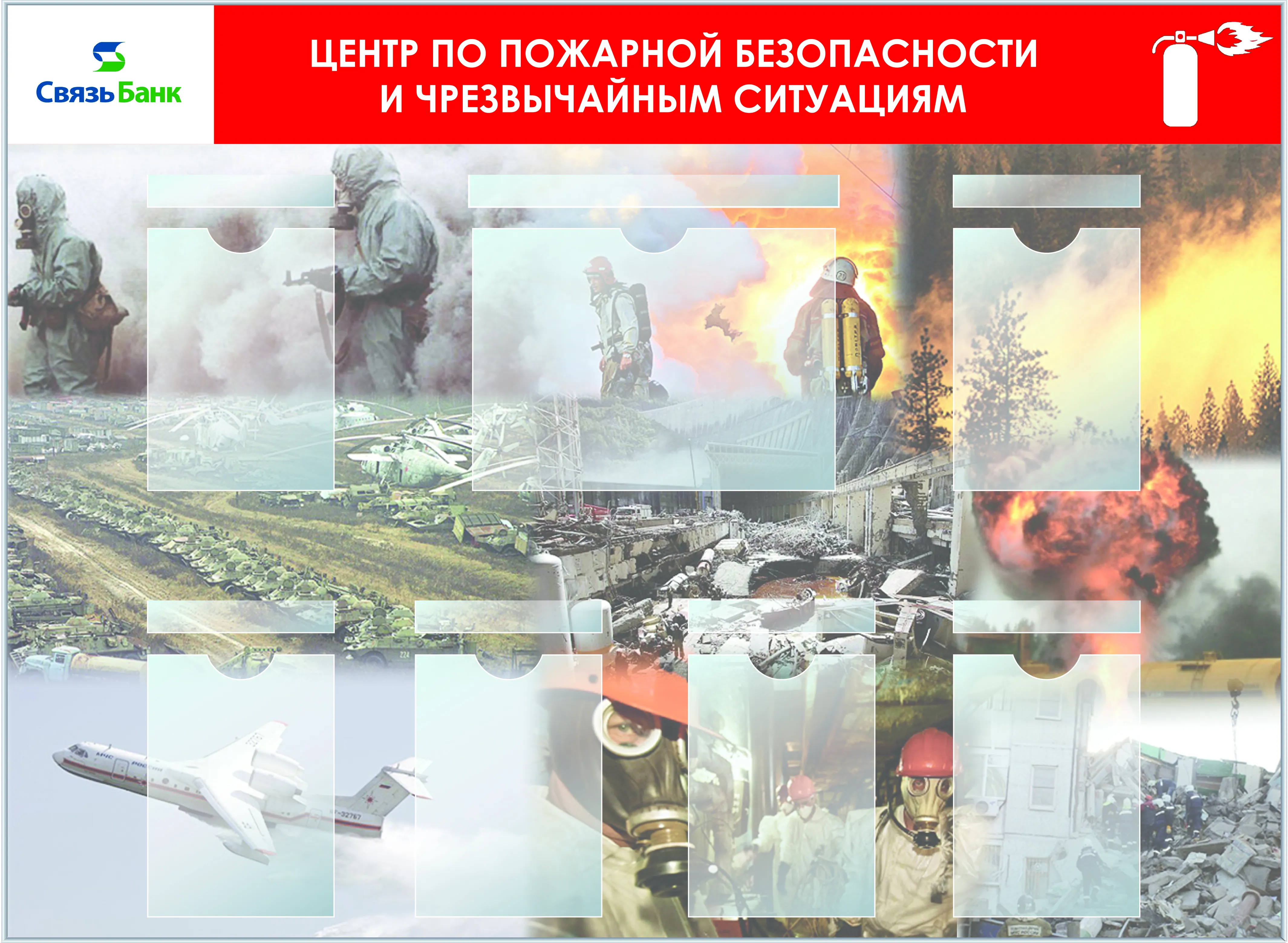 Стенд Центр по пожарной безопасности и ЧС, 6 объемных карманов 220х300, 6 плоских карманов 220х50, (Пластик ПВХ 4 мм, алюминиевый профиль; 1500х1100)
