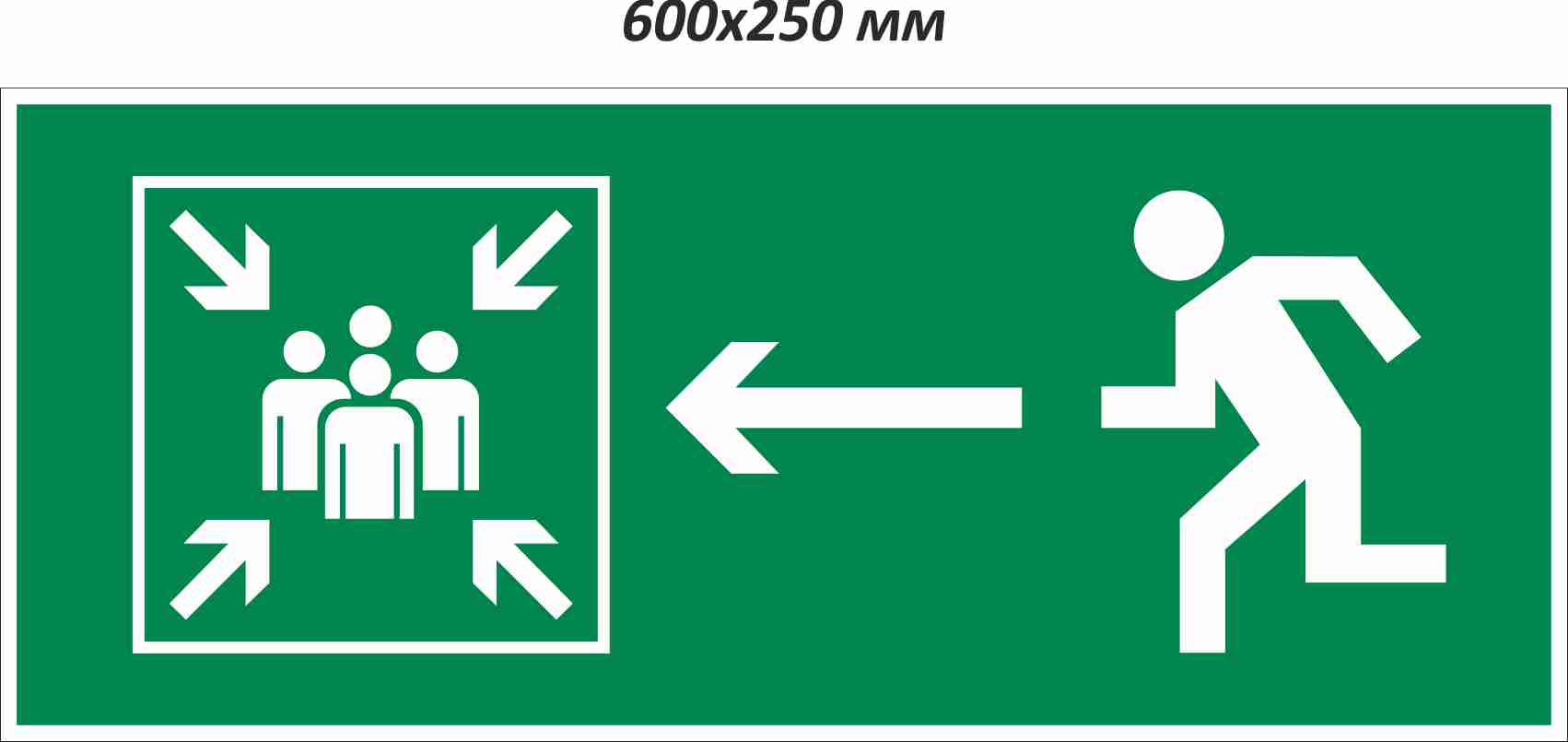 Для эффективной эвакуации людей при возникновении чрезвычайной ситуации на прилегающей к зданию территории должно быть предусмотрено место, где могут собраться эвакуируемые, покинув опасную зону. Чтобы сориентировать людей, на дверях помещений, стенах и прочих местах устанавливается знак, информирующий о направлении движения — «Направление к месту сбора при ЧС налево». Данный знак используется в составе эвакуационной системы и имеет соответствующее цветографическое исполнение: белые символы на фоне зеленого прямоугольника.Размер: 600х250; материал: металл 0,8 мм, полиэстеровое покрытие: