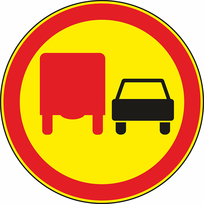 В период проведения ремонтно-восстановительных работ на дороге и в других подобных случаях, когда требуется запретить грузовикам опережение другого транспорта, используют знак «Обгон грузовым автомобилям запрещен». Запрет действует для любого автомобиля с допустимой предельной массой от 3,5 т. Место установки — одно-, двух- и трехполосные дороги в обоих направлениях при наличии повышенной опасности ДТП в связи с плохим состоянием дорожной поверхности, высокой интенсивностью движения или недостаточной шириной проезжей части.