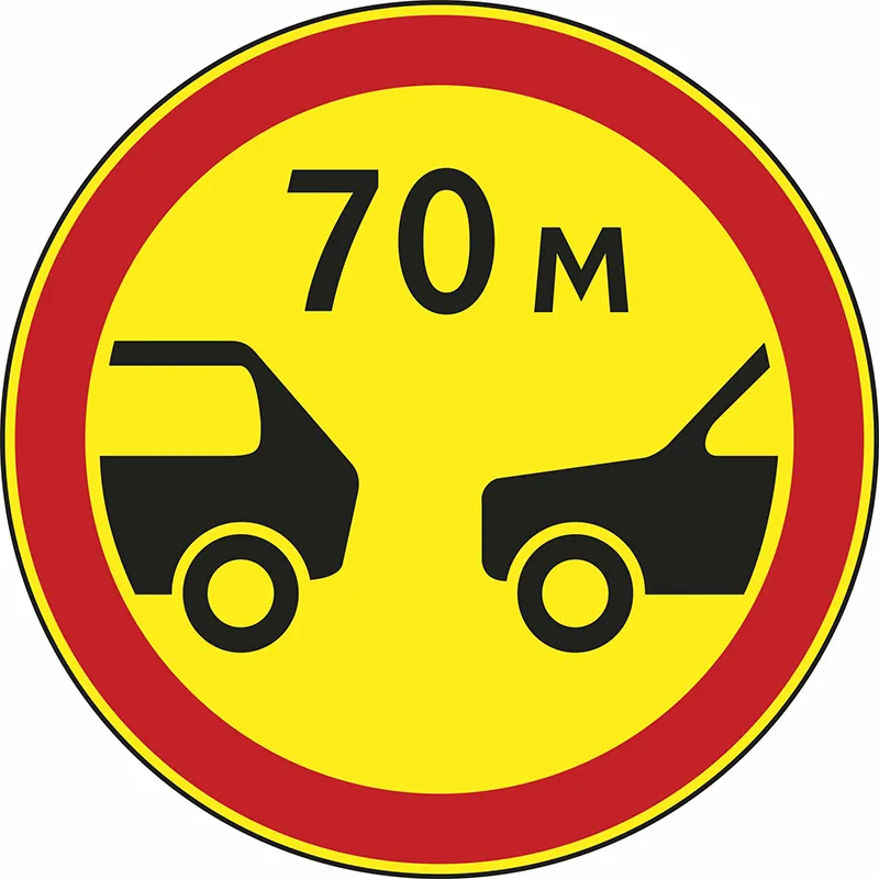 При проведении ремонтных работ на дороге и в других подобных случаях для безопасности движения необходимо снизить плотность транспортного потока. На таких участках используют «Ограничение минимальной дистанции» — этот знак определяет допустимое расстояние между двумя следующими друг за другом машинами (прочими транспортными средствами). Установленный знак предупреждает о том, что на этом участке дистанция между автомобилями (иным транспортом), которые движутся один за другим по одной и той же полосе, должна быть больше, чем указано на табличке.