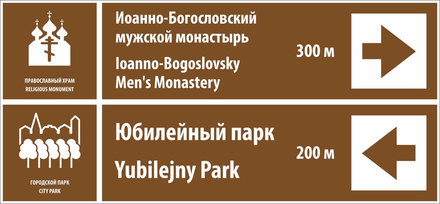 Указатель направления "Иоанно-Богословский мужской монастырь, 300 м, Юбилейный парк, 200 м" (1640х720; Металл 0,8 мм оцинкованный, световозвращающая пленка типа А ГОСТ Р 52290-2024; ), рама по периметру с креплением под 1 стойку